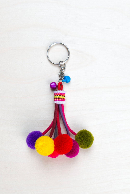 • Keyring with Pom-Poms and wooden beads